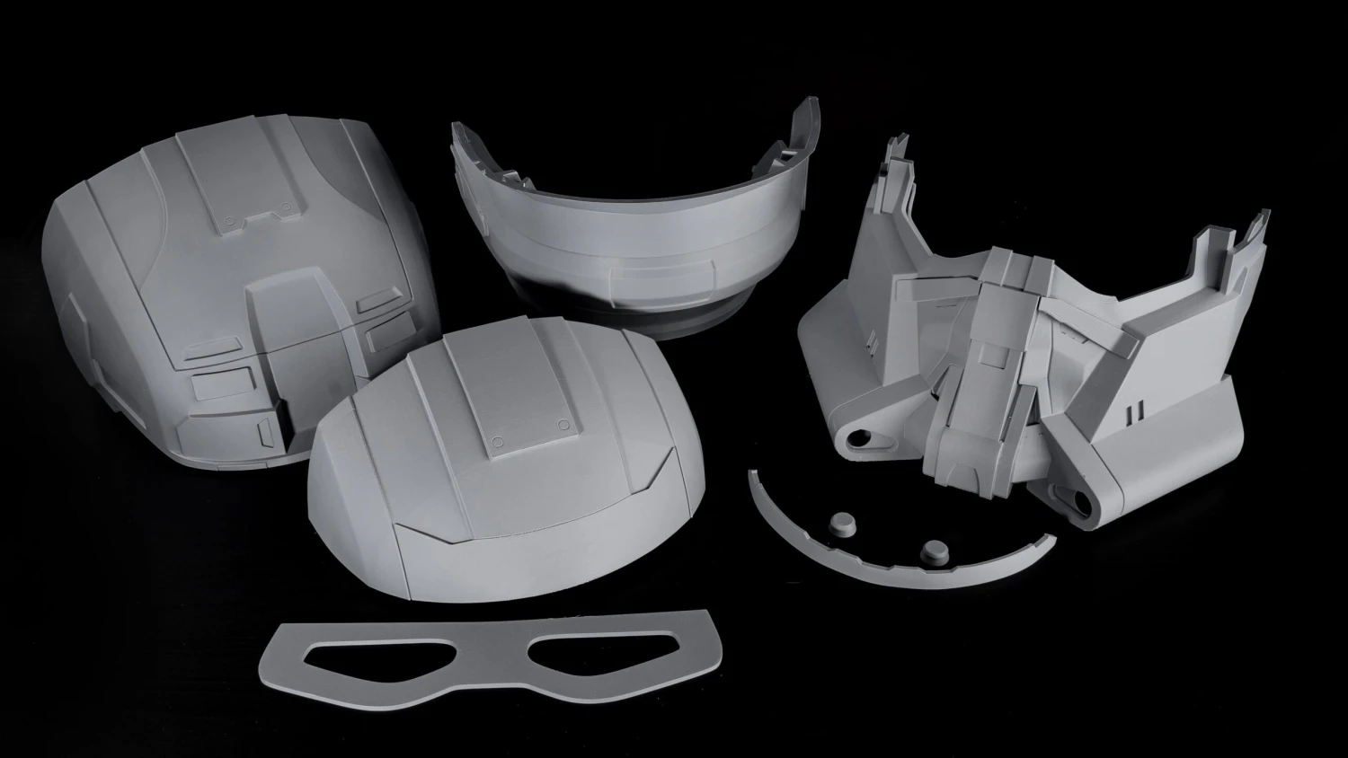 The helmet will be shipped in 8 pre-separated parts that will need assembled together. A visor cutout template is included, use this template to trace out a face shield that will fit inside the pre-modeled ridge!