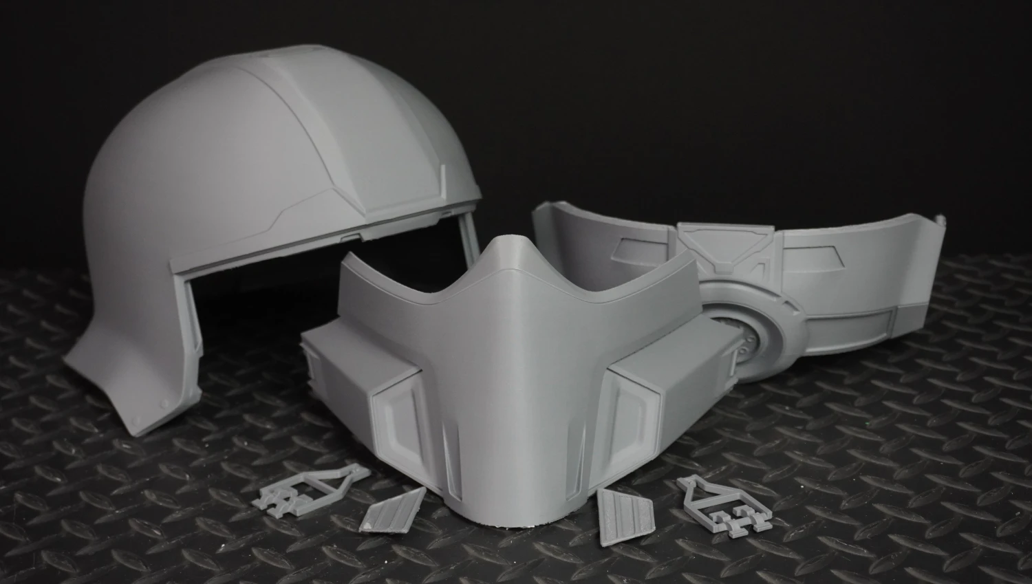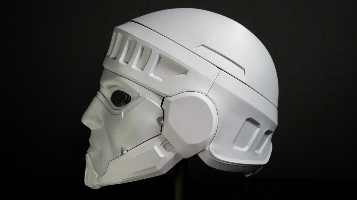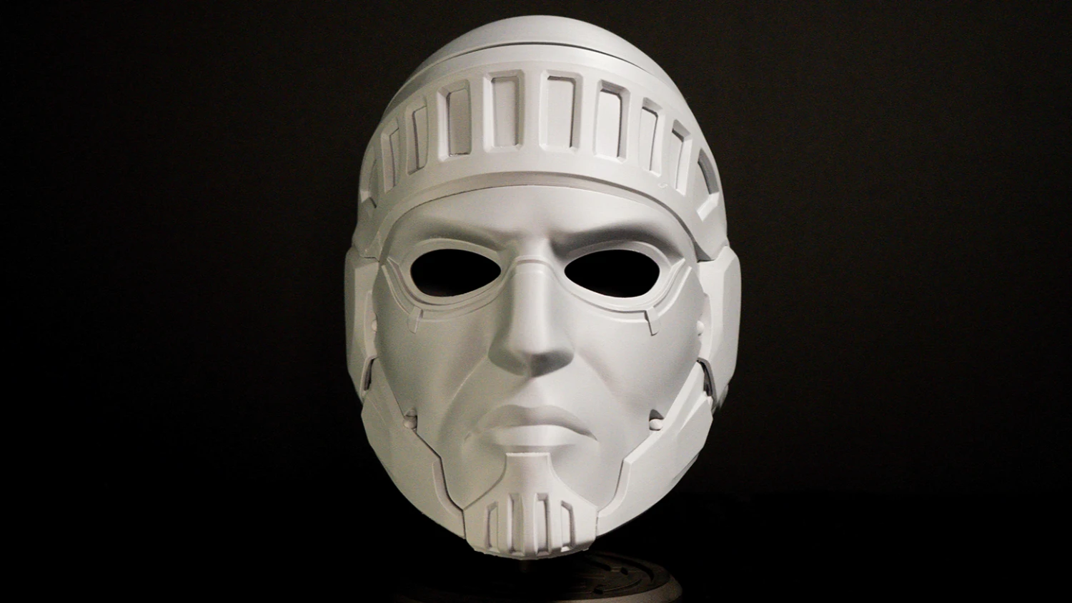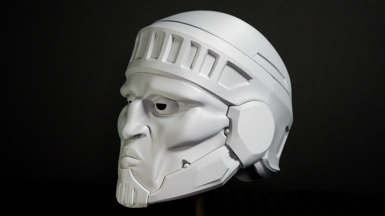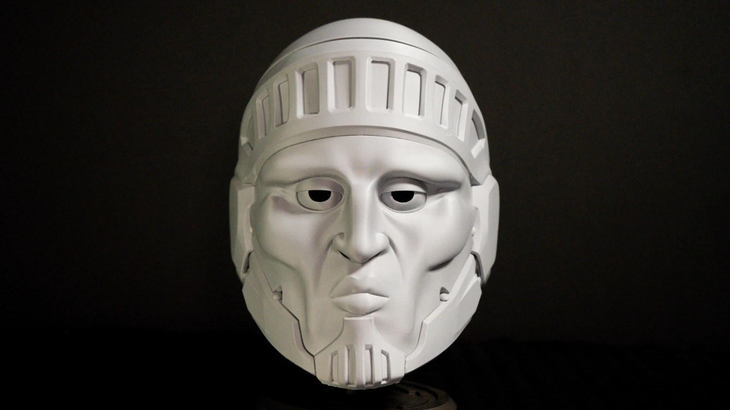 A 3d printed replica helmet of the Righteous Helmet from Helldivers 2.