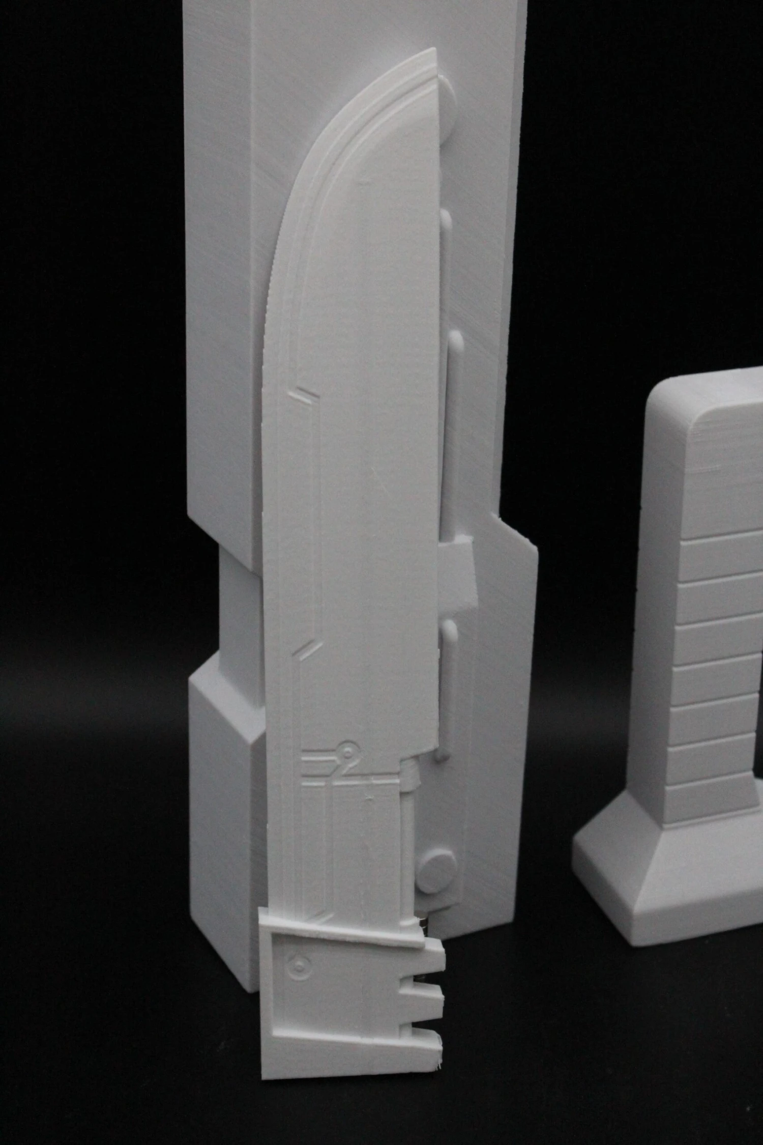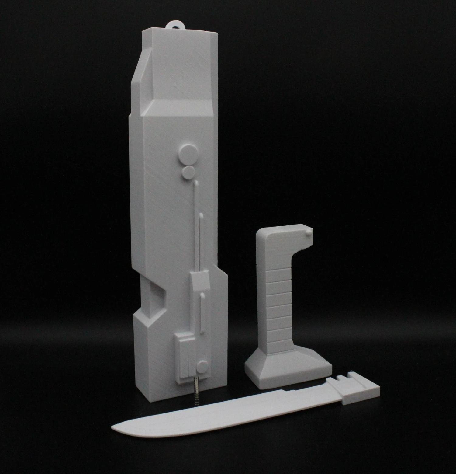 This knife is printed in PLA and is optimized for durability. A hole has been cut through the blade and handle for a 1/4″ wooden dowel rod to be inserted (not included) to provide superior strength for a 3D print.